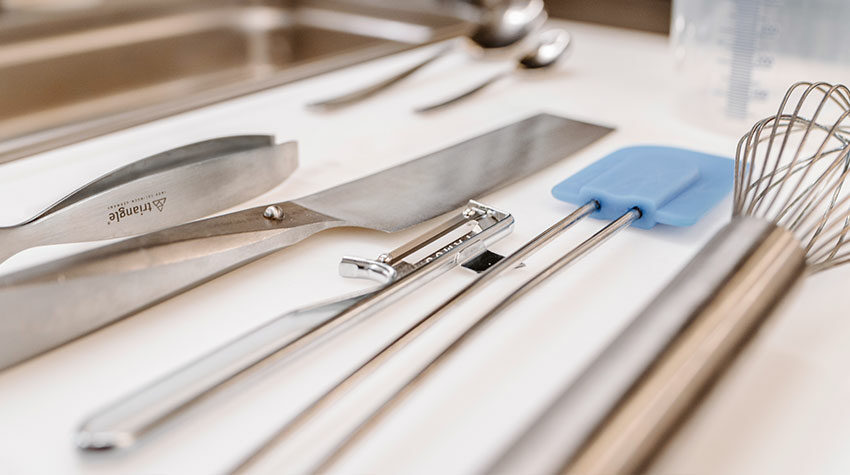 Zunächst einmal müsst ihr Schneebesen, Messer, Schäler und die anderen benötigten Utensilien zurechtlegen.