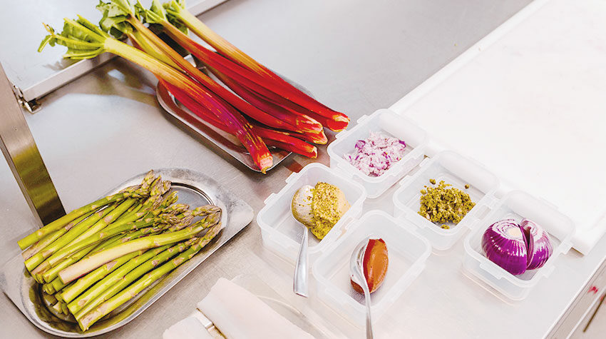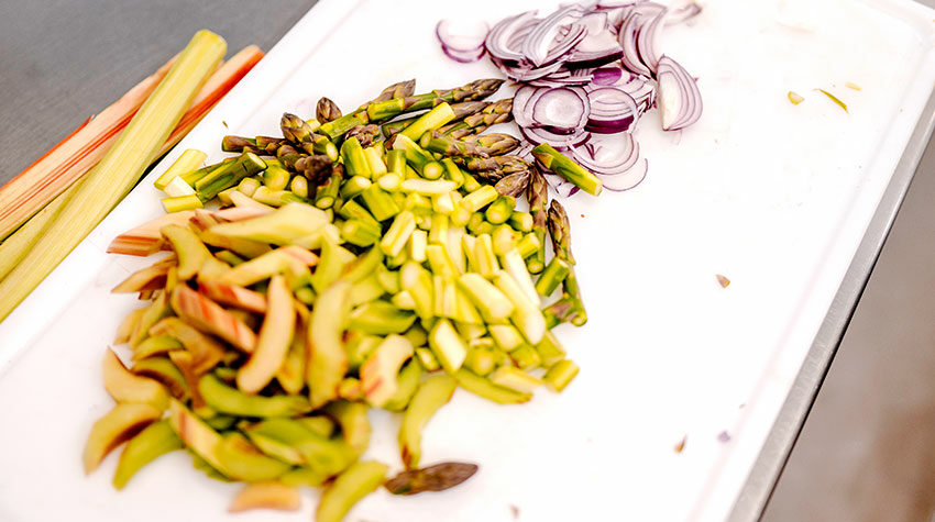 Schneidet und schält den Rharbarber, den Spargel sowie die Zwiebel.