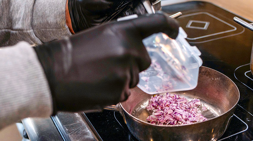 Nun wird das Gemüse in einer Pfanne scharf angebraten und auf mittlerer Hitze glasig angeschwitzt.