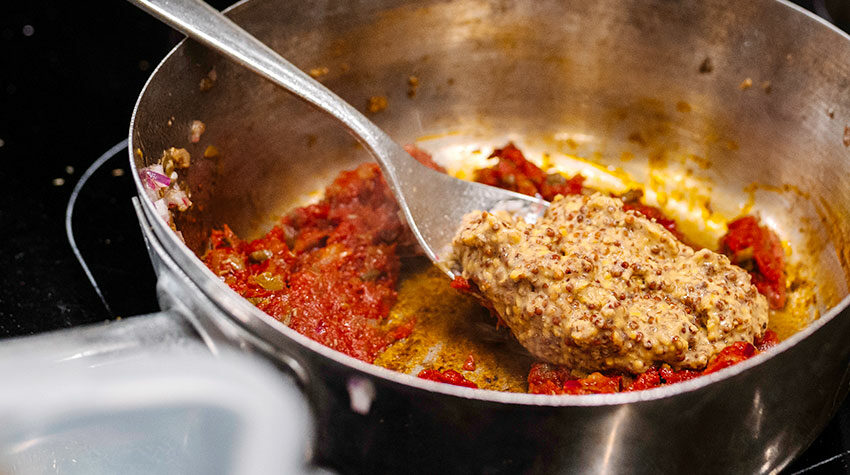 Nun gebt ihr das Tomatenmark hinzu und verrührt dieses. Zuletzt wird der körnige Senf untergerührt. Stellt die Mischung anschließend beiseite.